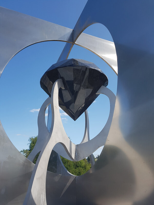 Auf dieser großen Skulptur sind mehrere Symbole dargestellt. Der Tarn Granit sehr symbolisch, da Thibaut in diesem Abbaugebiet eine zweite Produktionsstätte hat. Die Enden der beiden Metallplatten sind zu den vier Himmelsrichtungen ausgerichtet. Die Form des Diamanten symbolisiert die Präzision der Thibaut-Maschinen bei all ihren Bearbeitungen.