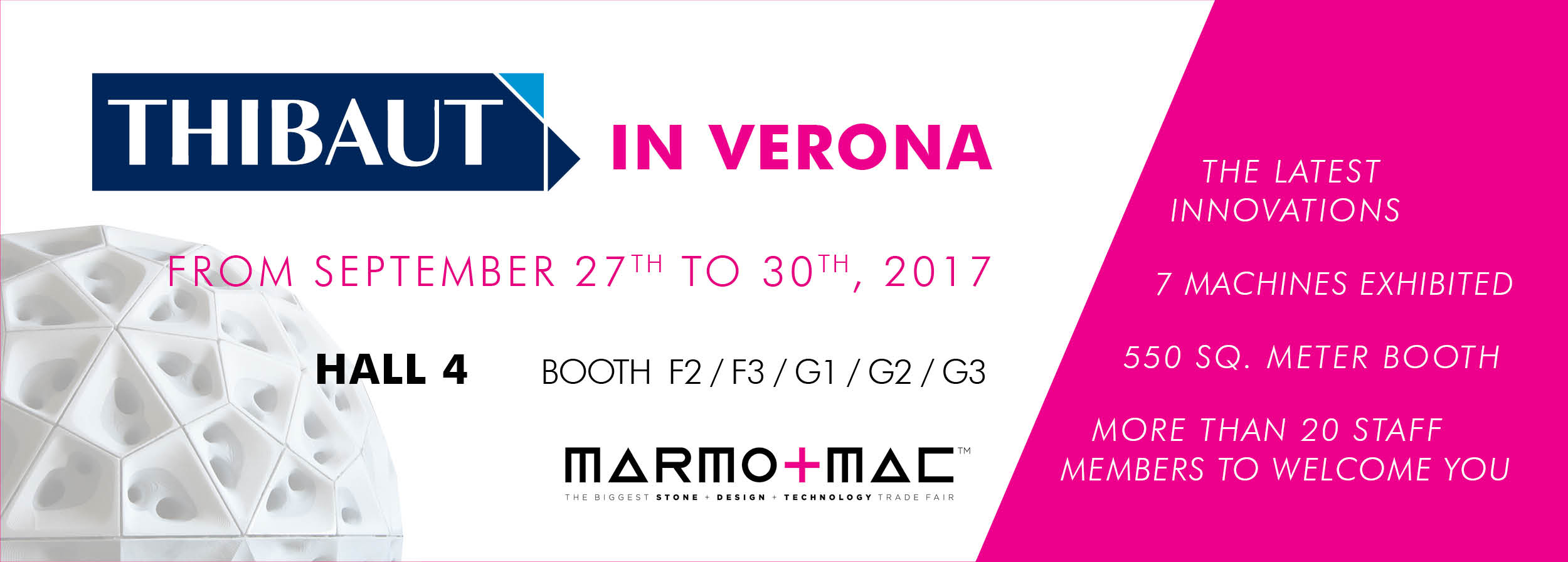 THIBAUT is exhibiting at Marmo+Mac show in Verona (Hall 4 - Booth F2-F3-G1G2-G3) from September 27th to 30th. We will display 7 machines and multiple equipments for machining all types of natural or agglomerated materials (ceramic, granite, marble, limestone, concrete, glass, engineered stone, slate...).
