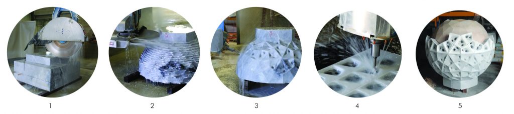 El proyecto "Polysphere" viene de una colaboración entre Thibaut, el fabricante francés de maquinaria para todo tipo de materiales naturales o aglomerados (granito, mármol, piedra caliza ...), Chevrin-Geli, una empresa especializada en la restauración y rehabilitación de edificios antiguos, que compartieron su centro de corte Thibaut TC1100 y su experiencia, la cantera Yelmini que proporciono las piedras para trabajar la esfera y los arquitectos italianos Giuseppe Fallacara y Mauricio Barberio que diseñaron esta obra maestra original.