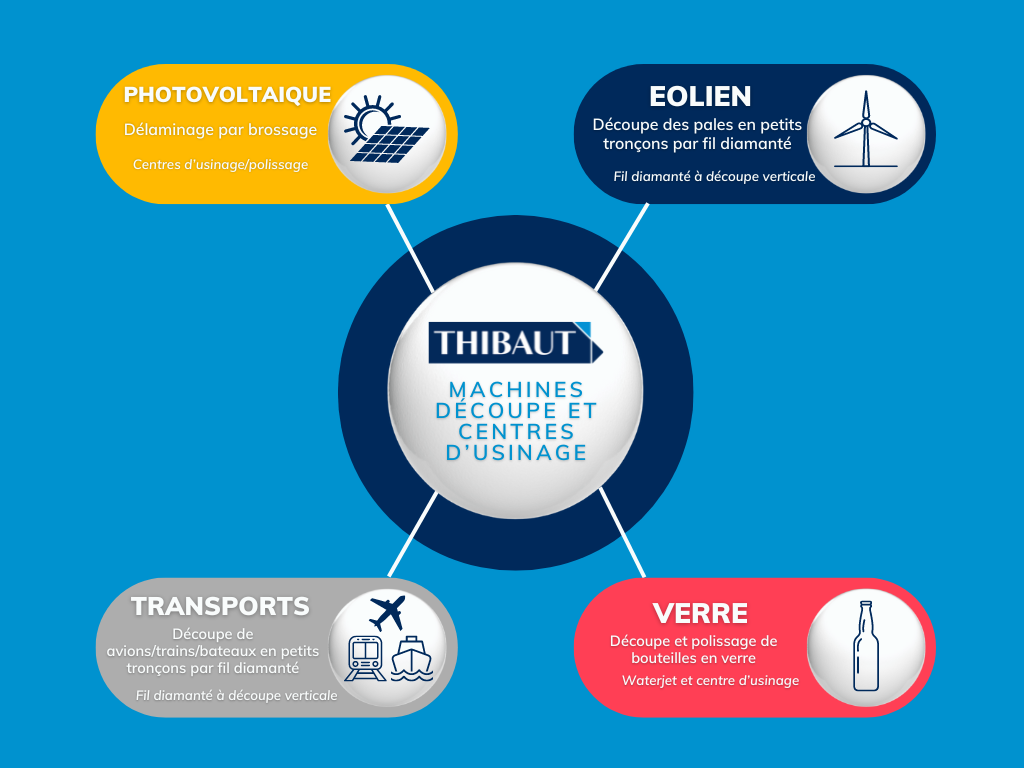 Avec l'augmentation constante du nombre d'installations éoliennes et photovoltaïques atteignant leur fin de vie, le besoin de solutions efficaces pour le démantèlement des éoliennes et le recyclage des panneaux photovoltaïques devient crucial. L'entreprise THIBAUT se positionne à l'avant-garde de cette révolution industrielle avec ses machines à fil diamanté, spécialement adaptées pour la découpe des pales d'éoliennes et des panneaux photovoltaïques.