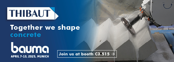 À l'occasion du salon Bauma, Thibaut présentera ses solutions machines pour le texturage du béton préfabriqué, dotée de polissoirs à plat ainsi que de centres d'usinage 5 axes permettent le débit, l'usinage, le texturage et le polissage. Grâce à sa gamme complète de machines élaborées et montées en France, Thibaut veut exposer ses machines à commande numérique pour les entreprises travaillant le béton architectonique.